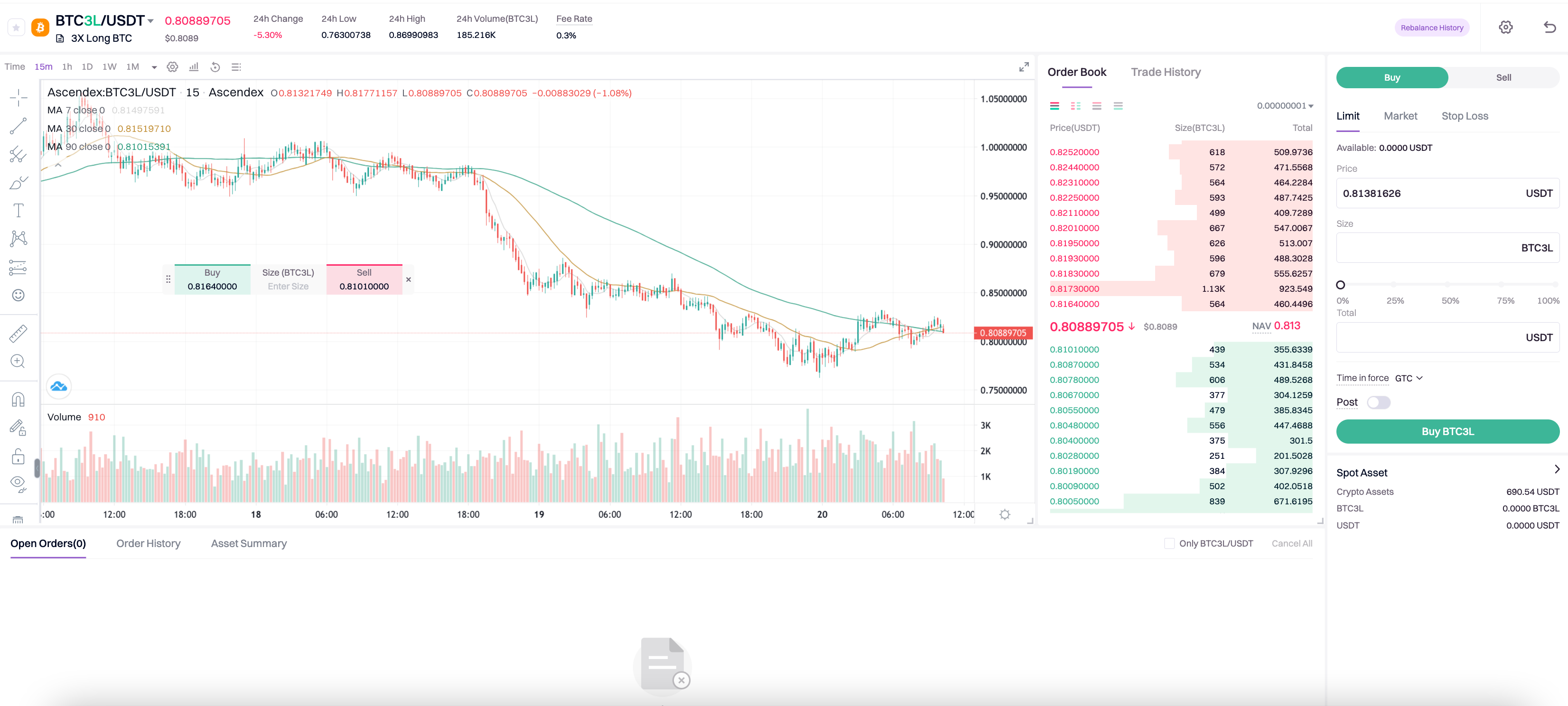 1. No additional collateral and easy operations. Leveraged token trading is similar to spot trading and users can trade leveraged tokens on spot trading UX, without having to put up collateral. Users can trade leveraged tokens on AscendEX’s spot market with just a few clicks.