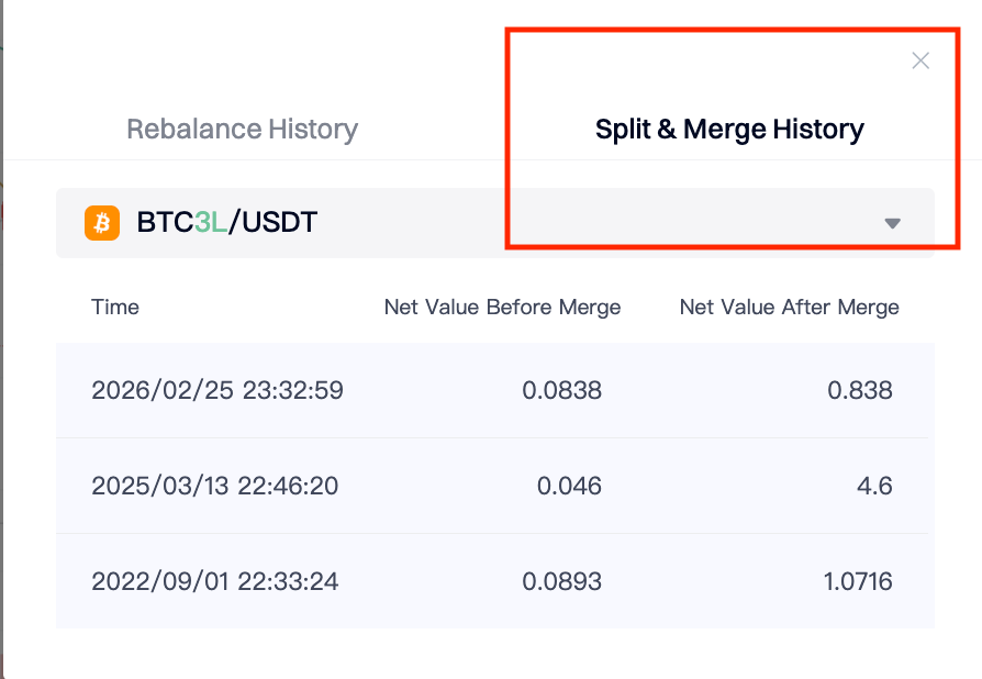 10. The initial net value of all leveraged tokens on the platform is 1. To optimize the user experience, if the net asset value of a leveraged token after a rebalance is lower than a given range, the platform will perform merge operation for the leveraged token. Likewise, if the net asset value of a leveraged token after a rebalance is greater than a given range, the platform will perform split operation for the leveraged token. AscendEX will regularly announce the net asset value merge/split history. Users can visit the Split and Merge page to check details.