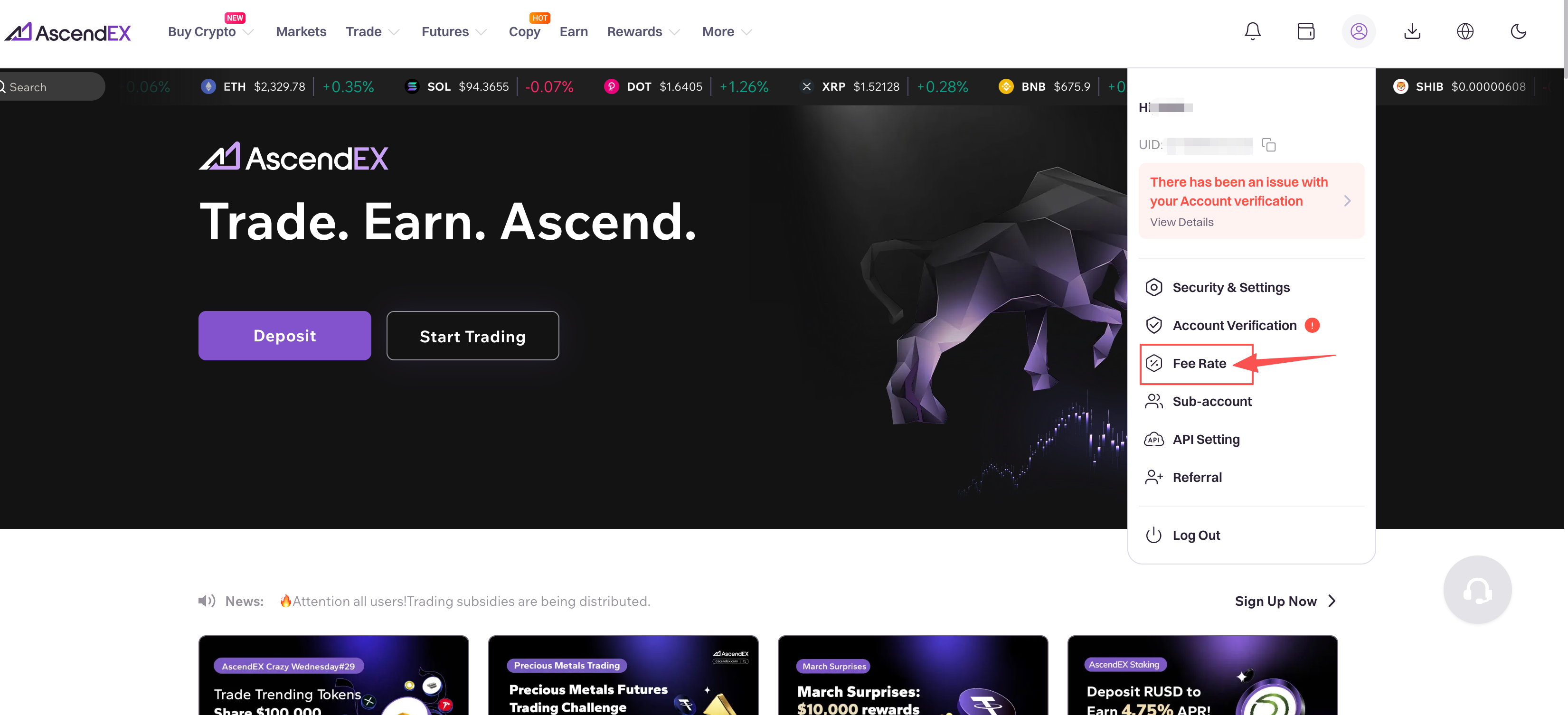 1. Log in to AscendEX website and click on profile icon in the upper right corner of the homepage. Select “Fee Rate” in the dropdown menu.
