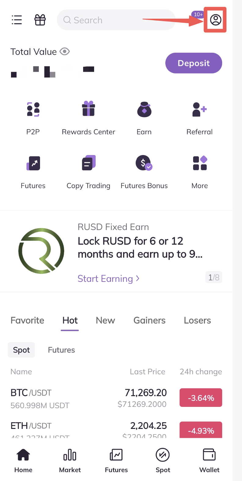 1) AscendEX App खोलें और होमपेज के ऊपरी बाएं कोने में प्रोफाइल आइकन पर क्लिक करें।