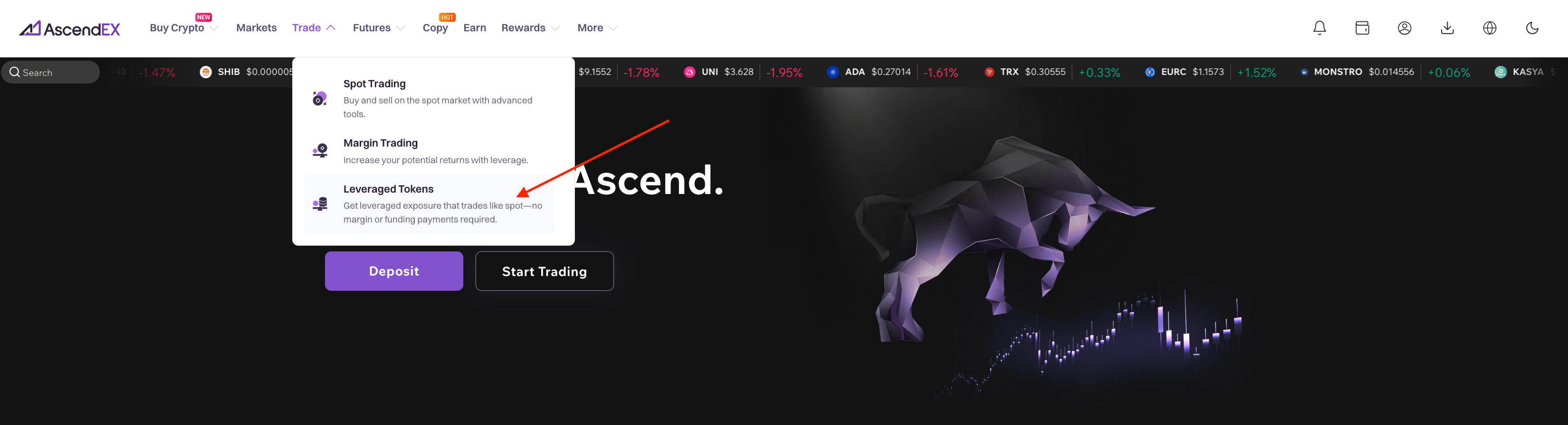 1. Log into AscendEX’s official website and click on Trade in the upper left corner of the homepage. Select Leveraged Tokens in the dropdown menu.