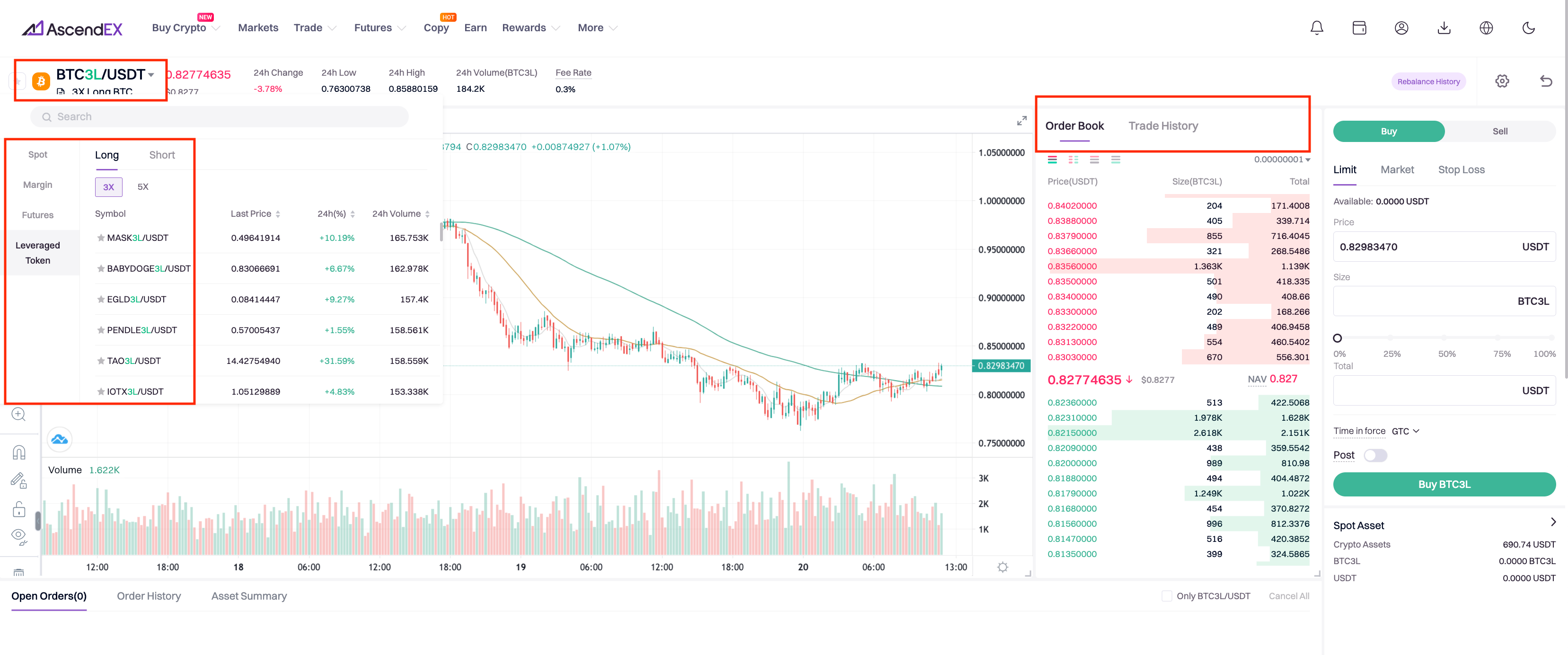 3. You can check leveraged tokens on the left side of the page or look for your preferred leveraged tokens based on the trading side or leverage ratio. You can also check the change, volume and historical trends of a specific leveraged token in the middle of the page. The leveraged token’s order and trading history is found on the right.