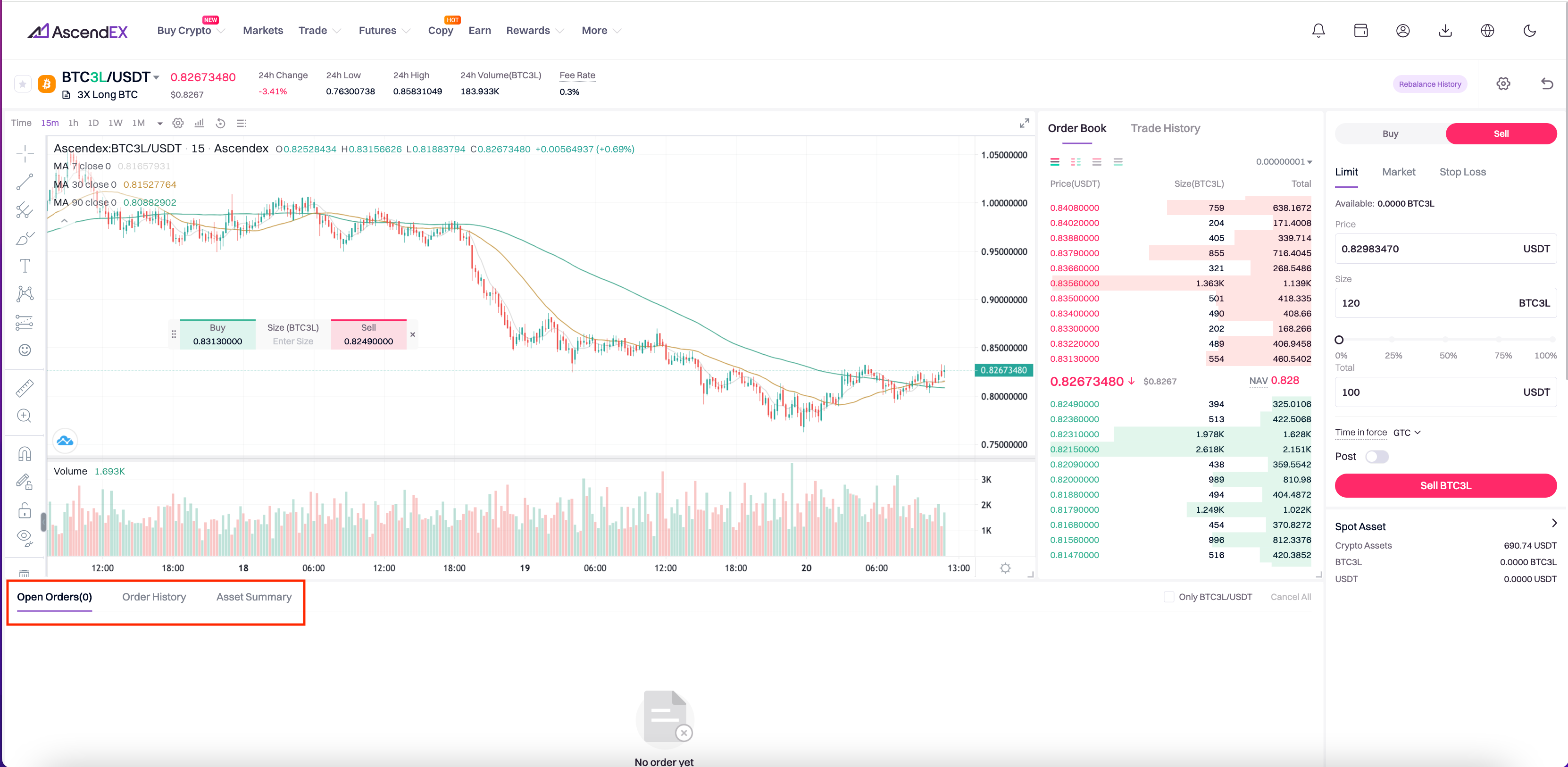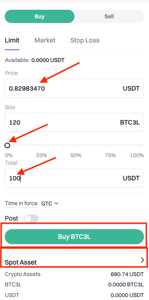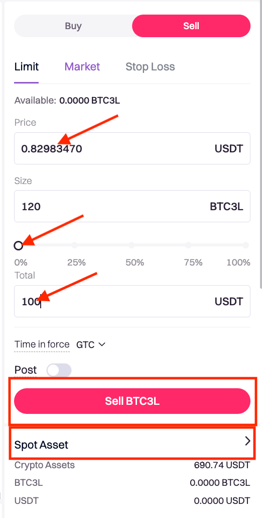 5. Take selling BTC3L as an example, select the order type in the action section below the candlestick charts and enter the buying price and amount of BTC3L, or drag the scale directly to choose the trading amount and volume. Confirm the order details before tapping on the Sell BTC3L button below.