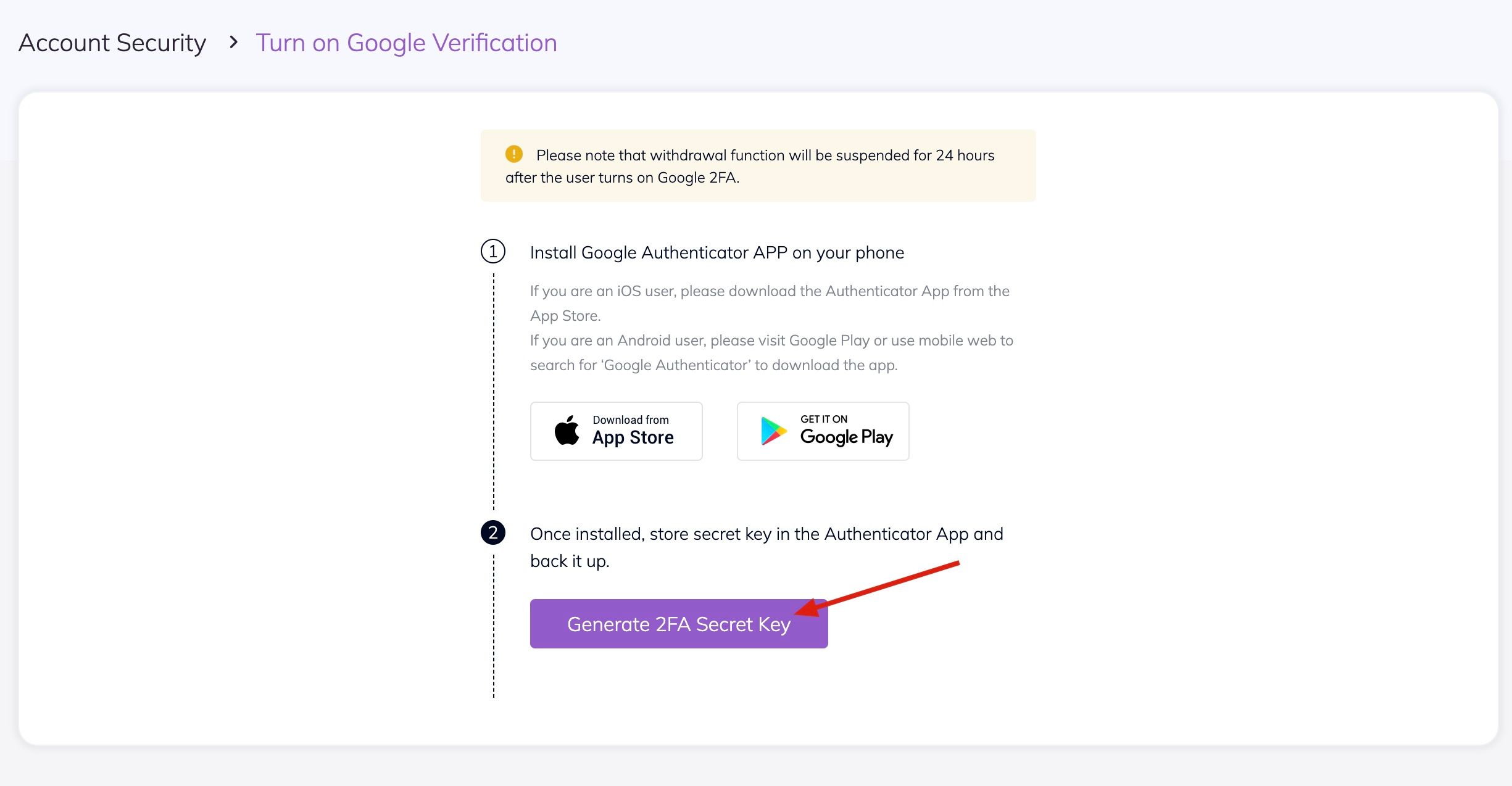 3. Follow the on-screen instructions to download and install Google (2FA) Verification, then click [Generate 2FA Secret Key].