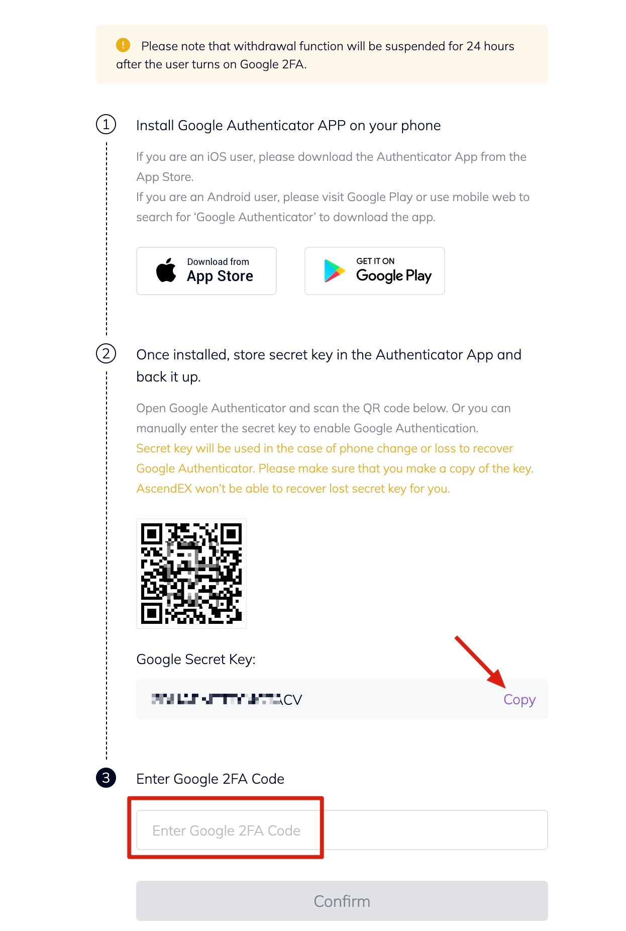 10. Return to the Google Authenticator page, enter the latest 6-digital code that your Authenticator generates, click on [Confirm].