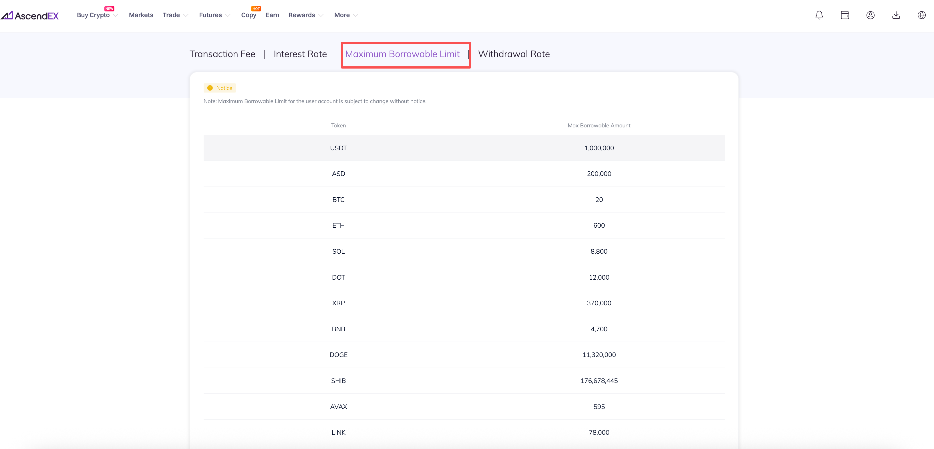 2) ในหน้าอัตราค่าธรรมเนียม ให้คลิกที่ “วงเงินกู้ยืมสูงสุด” เพื่อตรวจสอบขีดจำกัดการกู้ยืมสูงสุดที่แพลตฟอร์มกำหนดไว้สำหรับโทเคนแต่ละรายการในการซื้อขายมาร์จิ้น