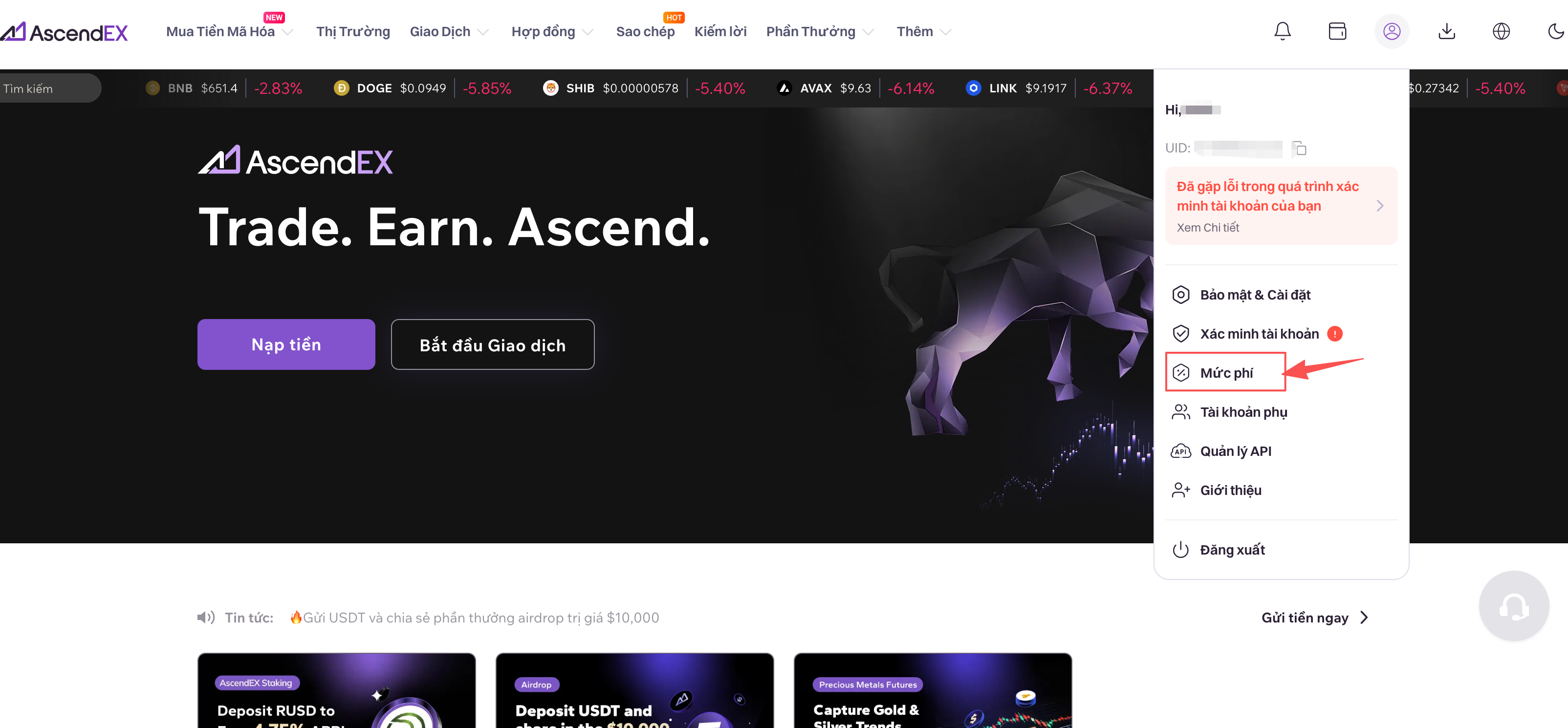 1.     Đăng nhập vào tài khoản AscendEX trên máy tính và nhấp vào biểu tượng hồ sơ của bạn ở góc trên bên phải của trang chủ. Chọn “Biểu phí” trong danh sách thả xuống.