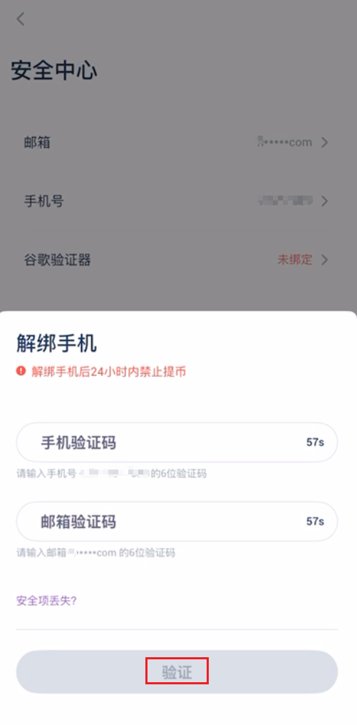 4.进入手机号解绑页面,点击发送,在相应位置依次输入收到的手机验证码、邮箱验证码,以及谷歌验证码 (如有绑定)。最后,点击验证按钮。