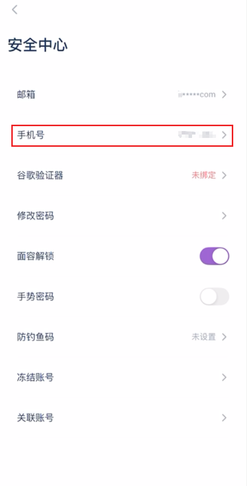 3.进入安全中心页面,点击手机号。