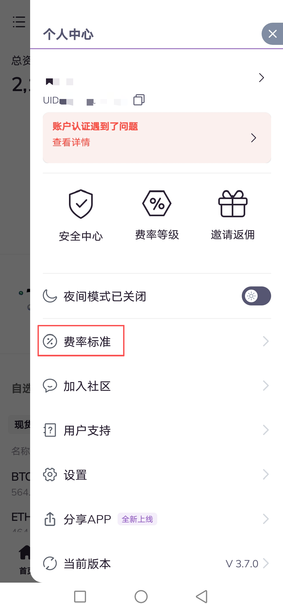 2.进入个人账户页面,点击费率标准。