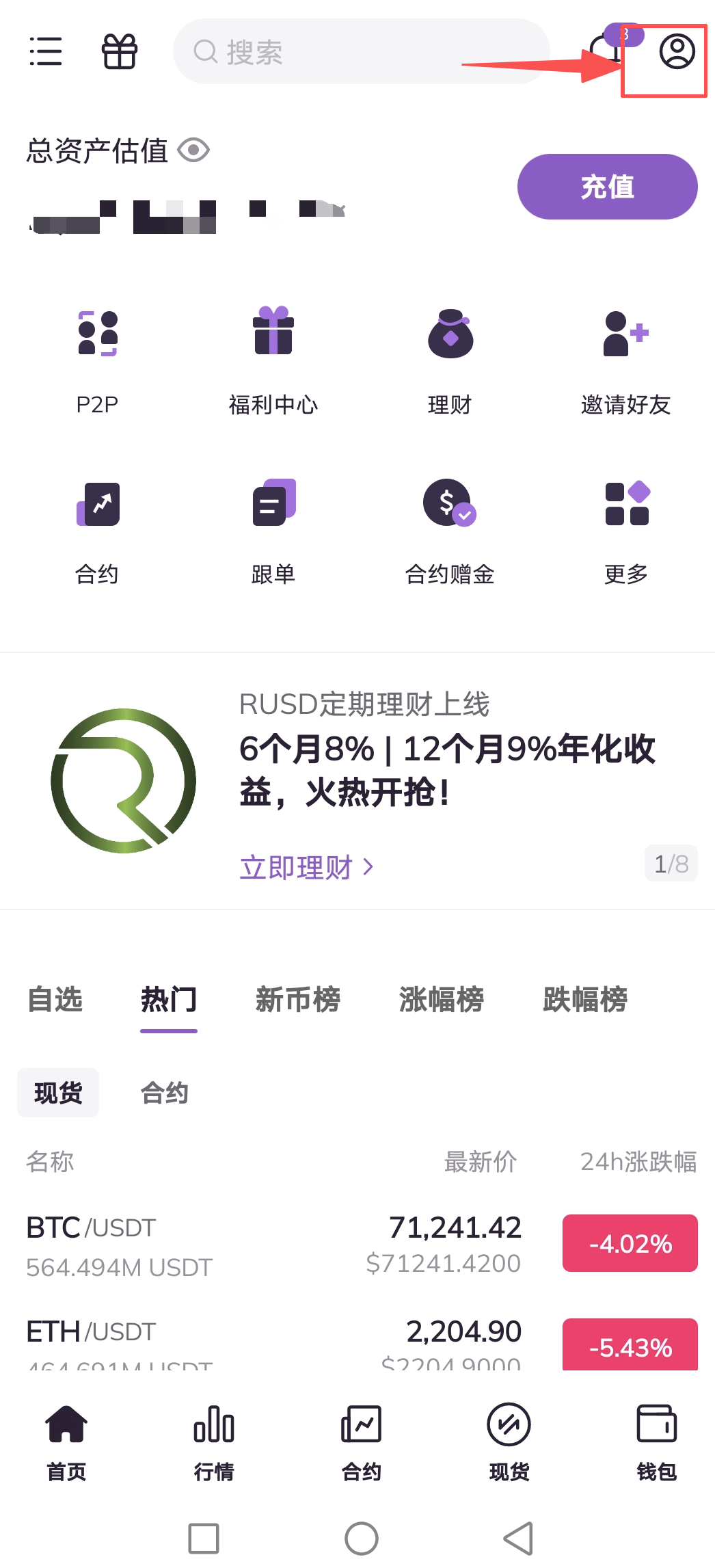 1.打开AscendEX APP,点击首页左上角个人头像。