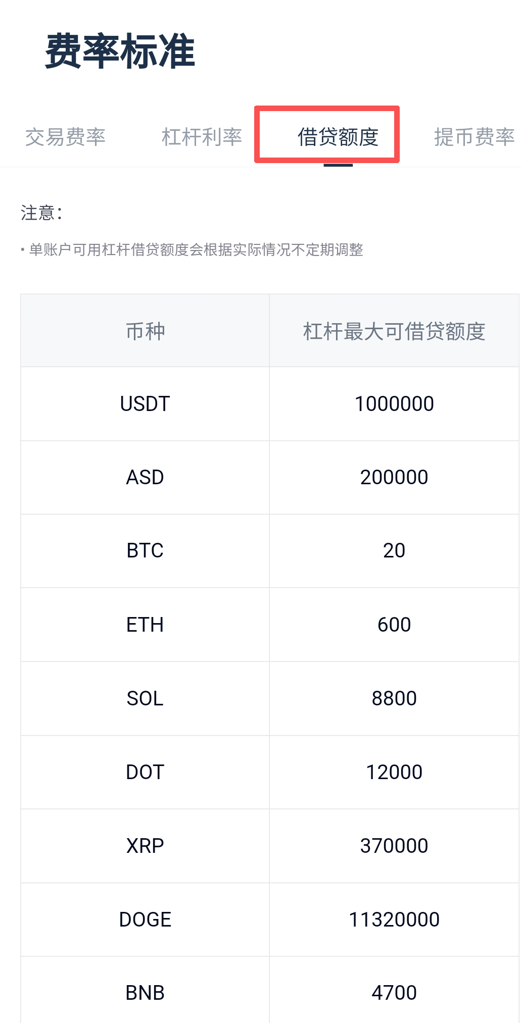 3.进入费率标准页面,点击借贷额度,即可查询各币种杠杆最大可借贷额度信息。