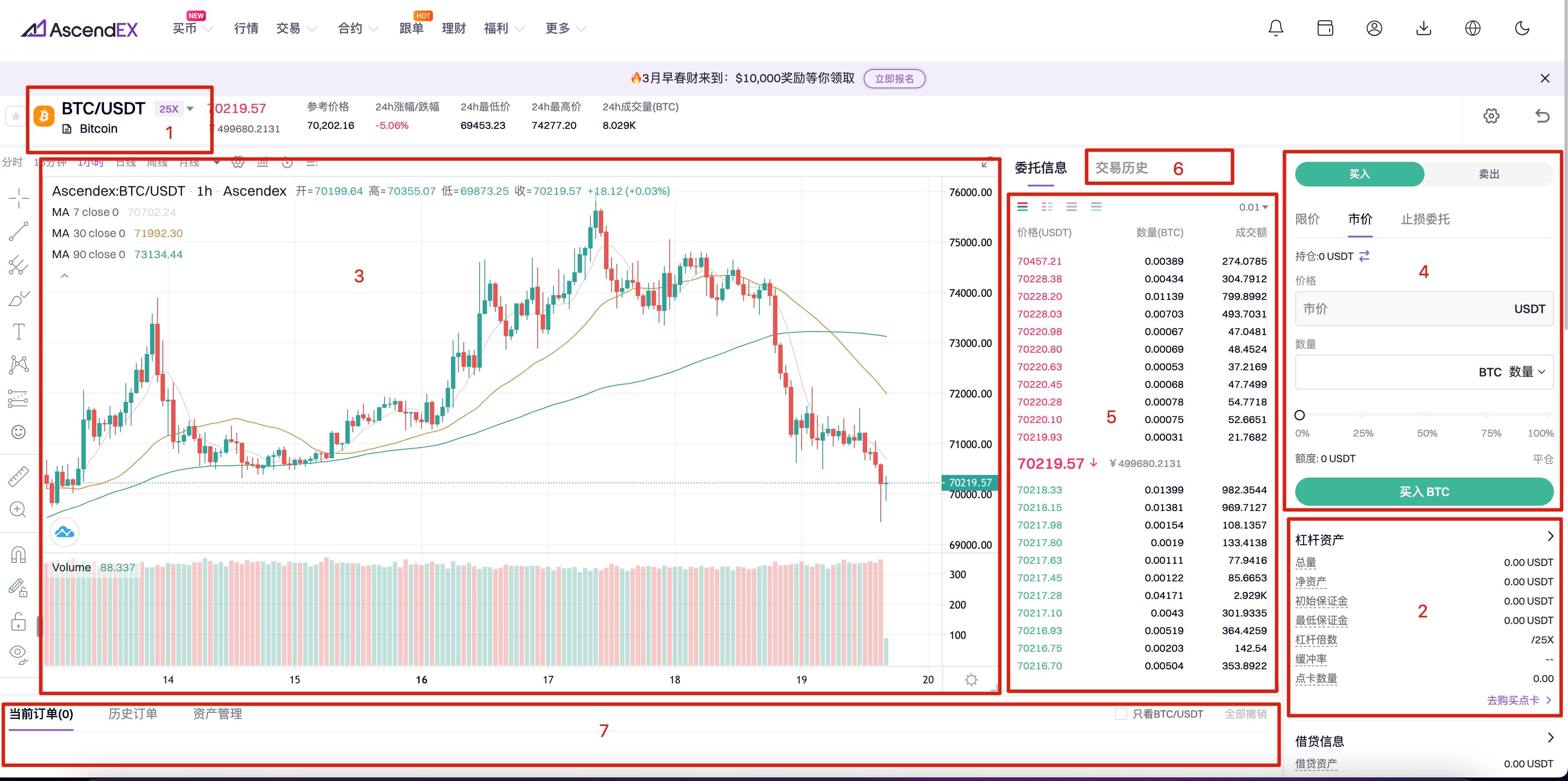 3. K線圖。 在該區域可查看當前杠杆交易幣種最新市場價格、歷史價格表現及行情走勢。